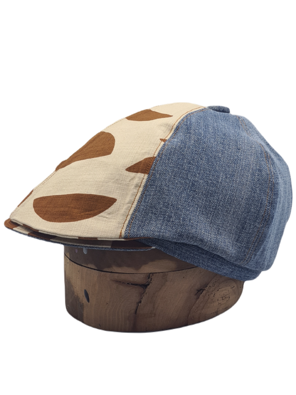Casquette Irlandaise à 6 tranches. La calotte est composée de 4 tranches en jeans bleu et de 2 tranches à motif géométrique. Cette casquette est une taille M et convient parfaitement à un 57 ou 58cm de tour de tête.